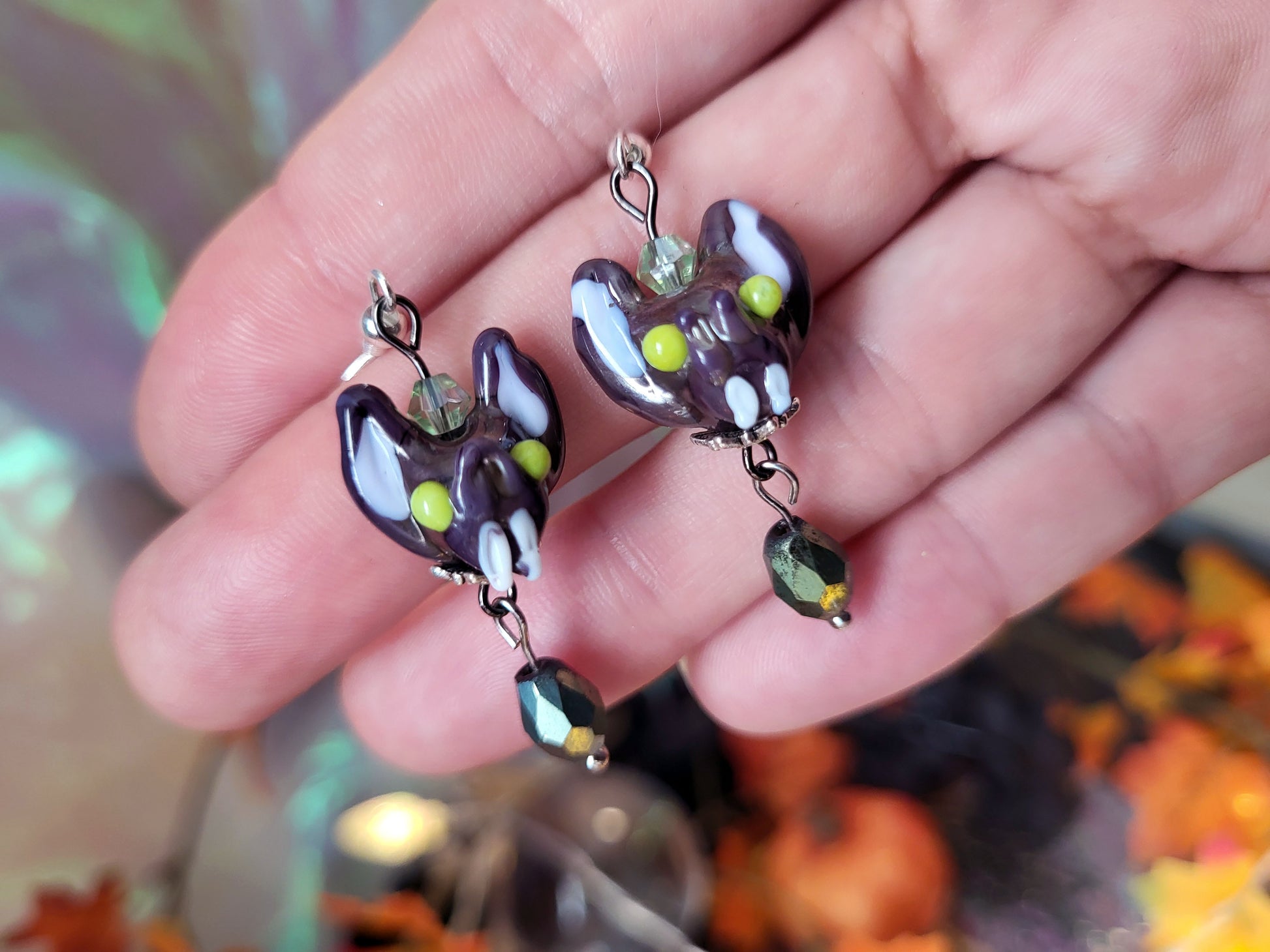 Obviously I need to put bats on everything, so I made tiny little glass bat head beads to put on jewelry, like these pretty little earrings!