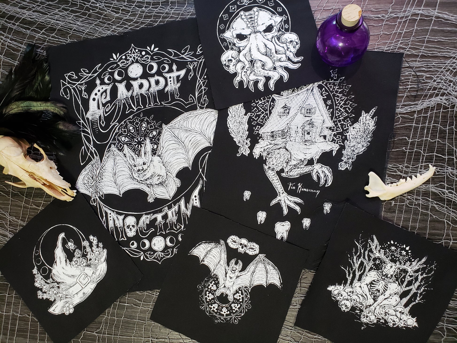 Patches of my banner designs are hand pulled screen prints on 100% cotton black fabric and are ready to be sewn onto anything your little heart desires!