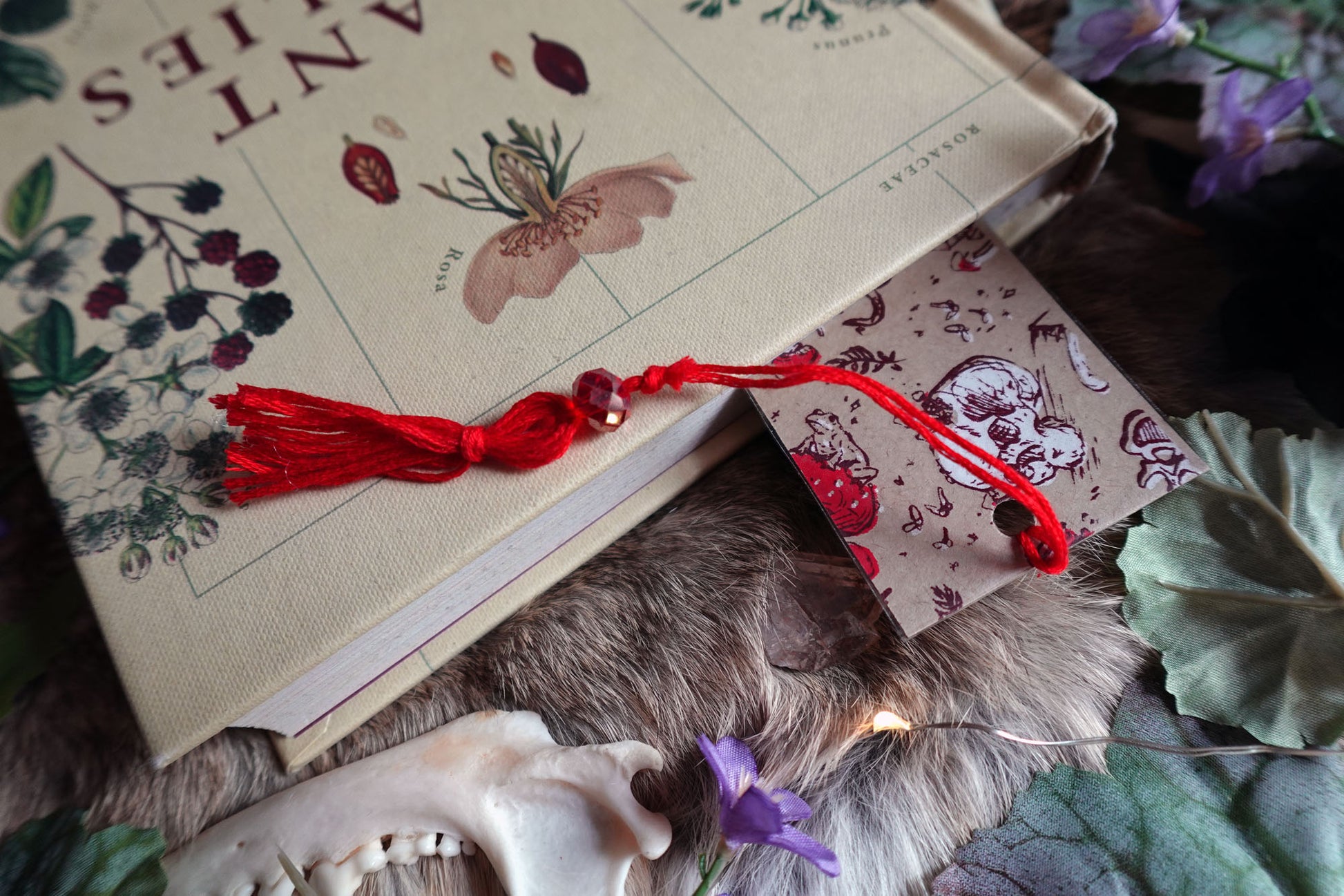 These bookmarks are hand printed in 3 colors with my special new pattern, and cut to 2"x6" rectangles, laminated for protection, and I even add a tassel with an iridescent red bead for that lil' extra shiny pizzaz! Every bookmark is a little different and may feature a different section of the print.