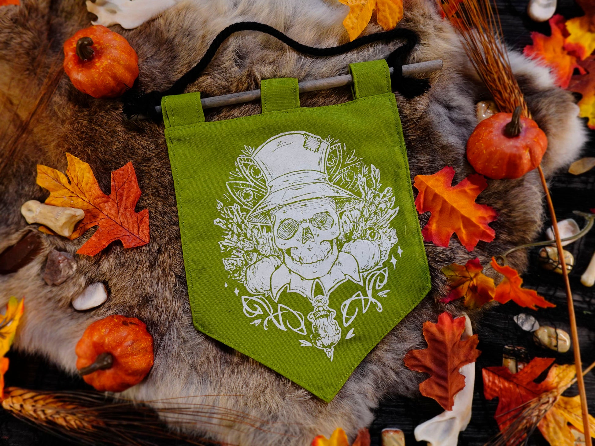 Each banner is hand screen printed with an intricate design on sturdy 100% cotton fabric, and sewn together lovingly by yours truly. They are 6" wide and 8.5" tall from the top of the loops to the bottom of the point. All designs are first hand drawn in pen and ink, then transferred to screens to be printed! For a truly unique product I am the only person who touches the banners from start to finish. Each one also has my signature printed on the back.