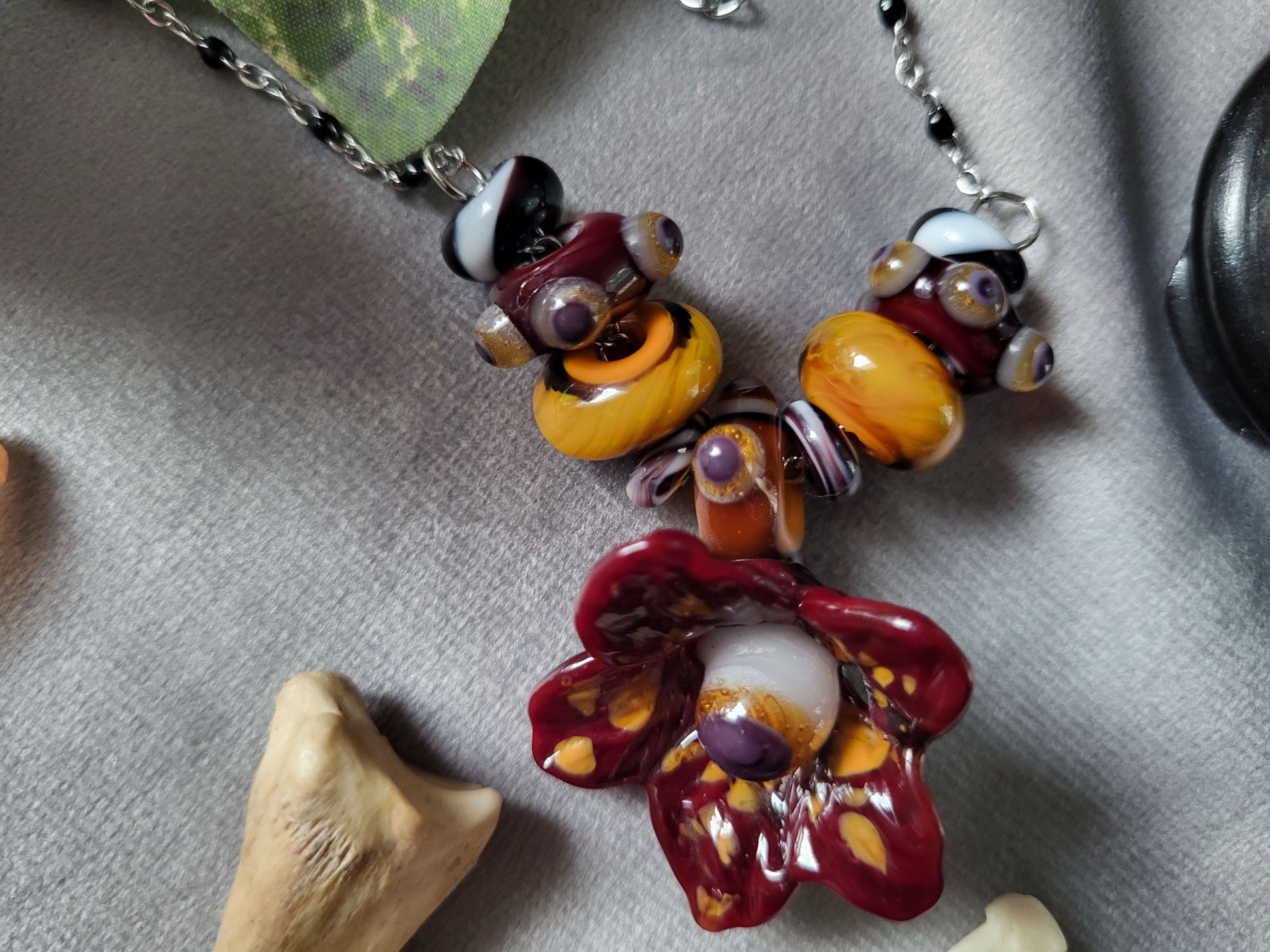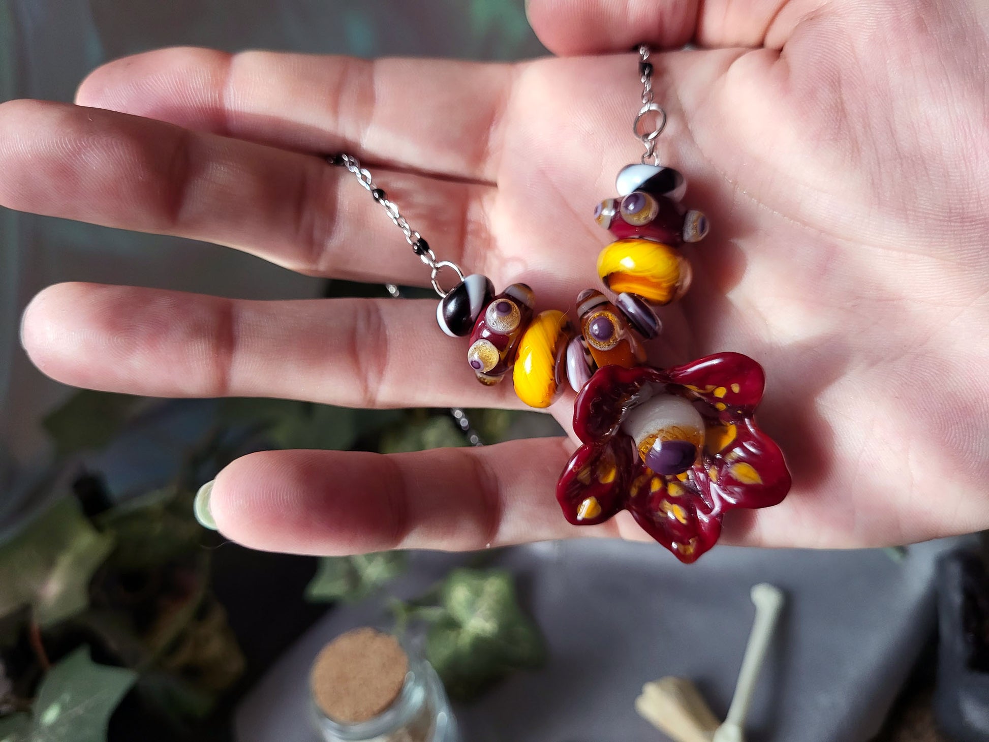 This necklace is inspired by my Baba Yaga's Garden collection and features a Sybil's Gaze flower pendant, eyeball decorated, and even chicken skin vibe beads!