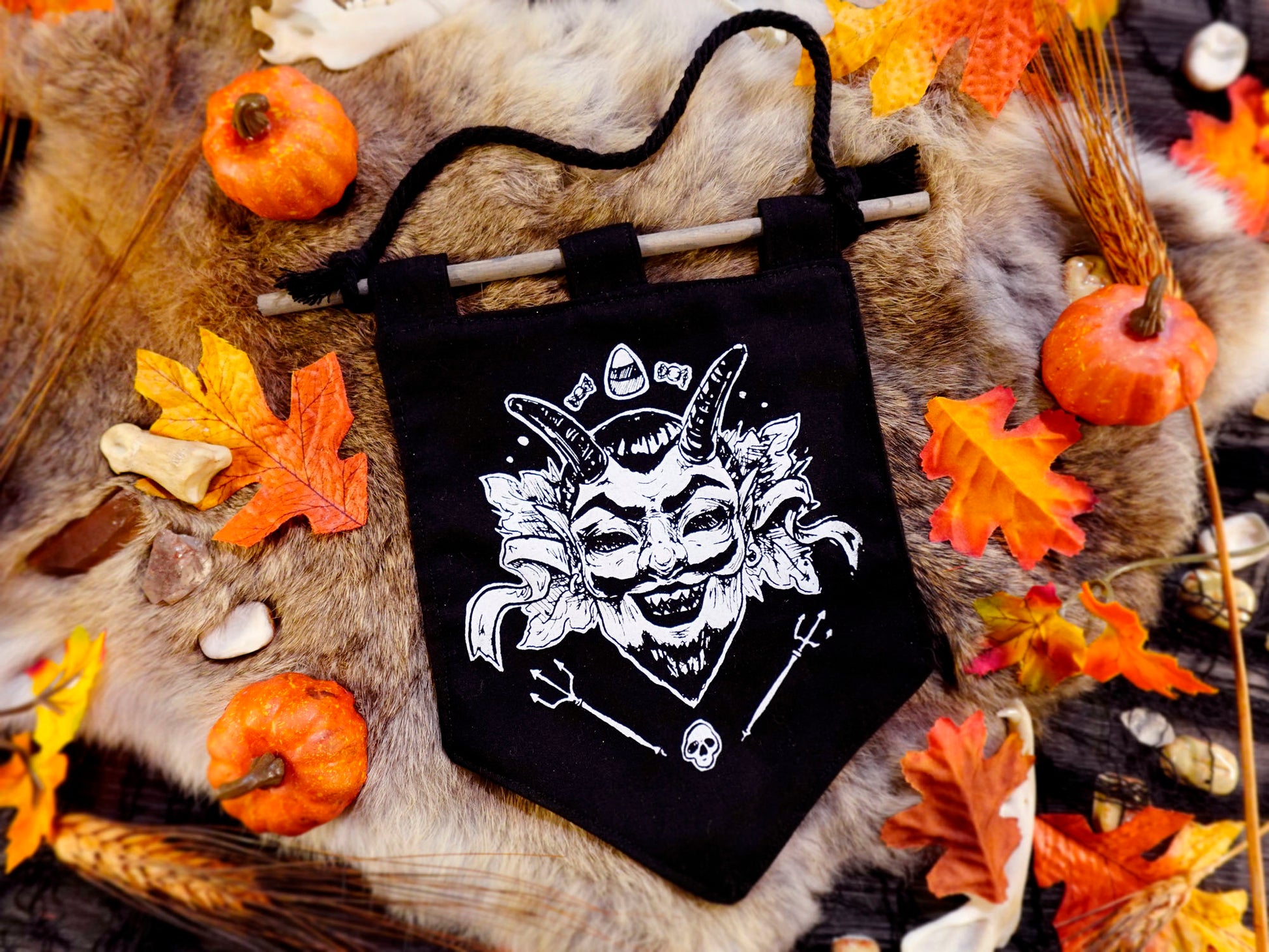 Each banner is hand screen printed with an intricate design on sturdy 100% cotton fabric, and sewn together lovingly by yours truly. They are 6" wide and 8.5" tall from the top of the loops to the bottom of the point. All designs are first hand drawn in pen and ink, then transferred to screens to be printed! For a truly unique product I am the only person who touches the banners from start to finish. Each one also has my signature printed on the back.